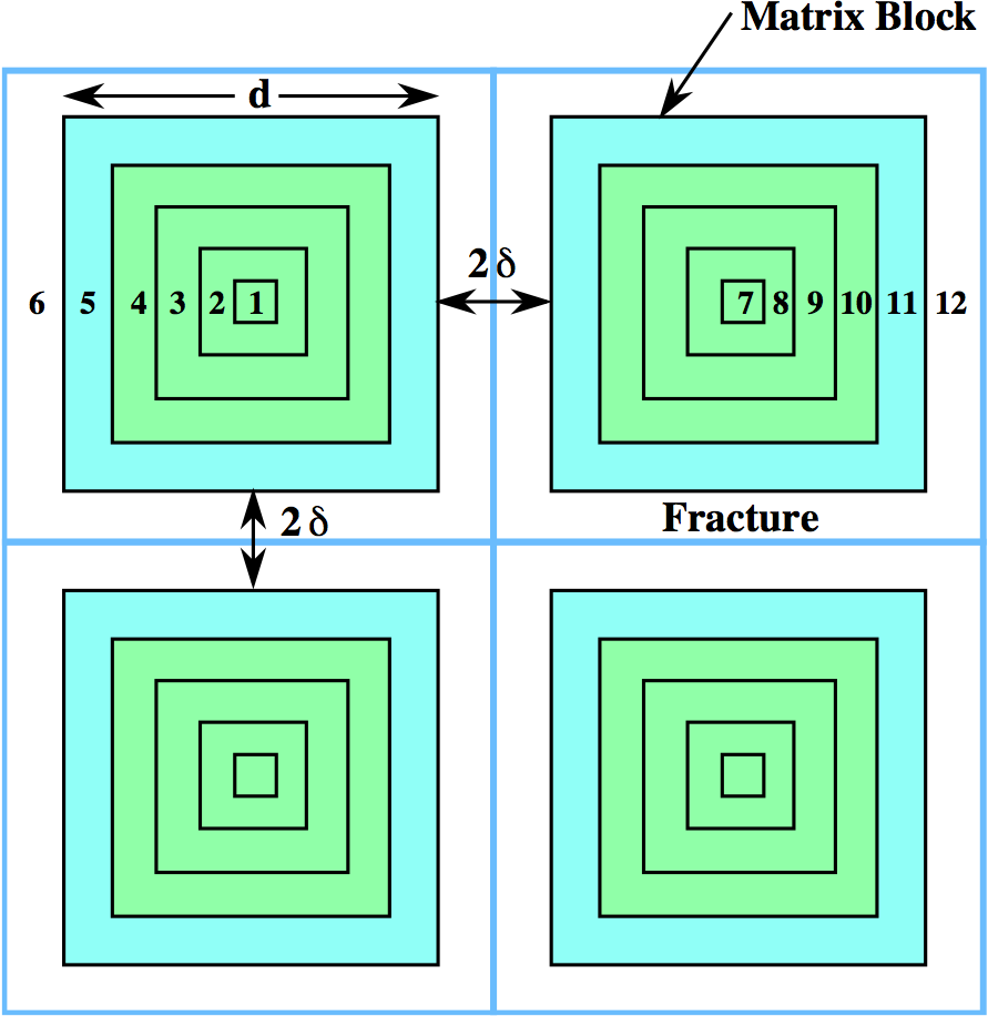 Control volumes in DCDM multiple continuum model with fracture aperture \(2\delta\) and matrix block size \(d\).¶